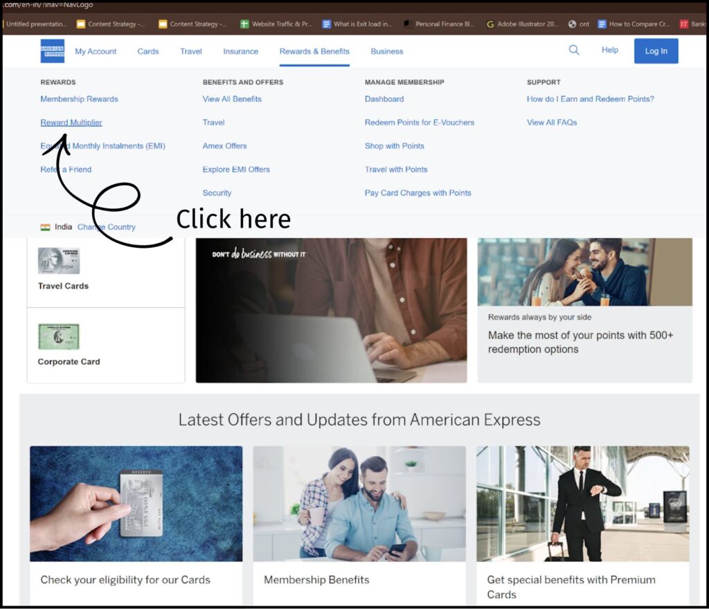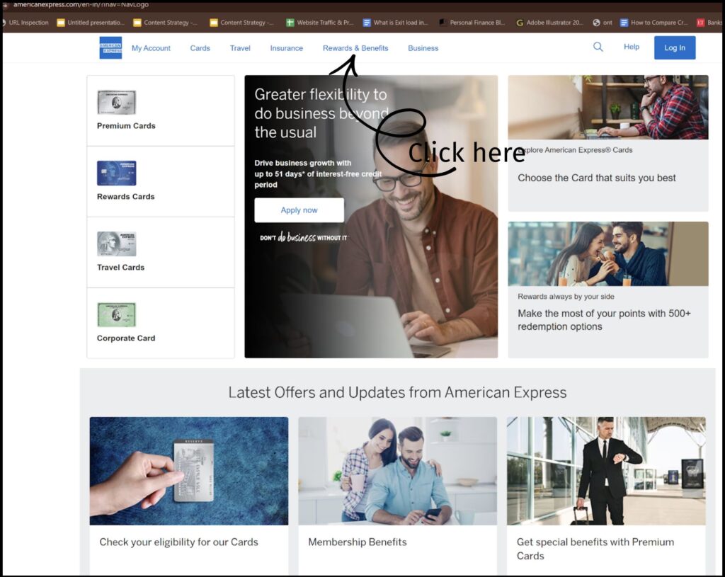 - Log in to your American Express India account via the official website or mobile app and click on Rewards & benefits.