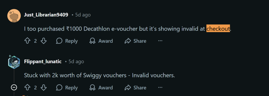 - Some offline vouchers (like Reliance Digital or Swiggy) were declined at physical stores because staff were not used to the new format.