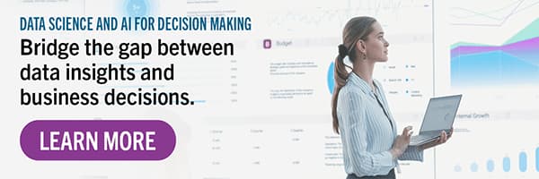 If you want to take your learning further, consider HBS Online’s Digital Transformation and AI Learning Track, which includes Data Science and AI for Decision Making. Participants who complete three digital transformation and AI courses within 18 months can earn an advanced Certificate of Specialization.