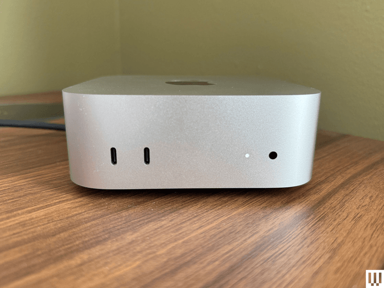 Front view of Apple Mac Mini M4 2024, a silver square shaped computer with small ports in the front