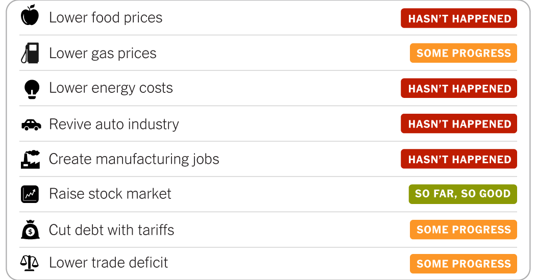 President Trump campaigned in 2024 on promises to “end inflation,” bring back manufacturing jobs and deliver an economic boom. A year after he returned to the White House, he has yet to deliver on those pledges. Still, there has been progress in some areas, and the economy has proved surprisingly resilient.